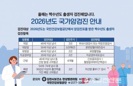 김천시는 암 조기 발견과 시민 건강 증진을 위해 2026년 국가암검진 수검 독려에 나섰다. 올해 검진 대상자인 ‘짝수년생’ 출생자들이 검진을 미루다가 놓치거나 연말에 몰려 겪게 될 불편을 미리 방지하기 위함이다. 올해 국가 암 검진 대상자는 짝수년도 출생자로, 암종별 대상 연령 기준에 해당하면 지정 의료기관에서 무료 또는 본인 부담 10%로 검진을 받을 수 있다. 검진 항목은 위암, 간암, 대장암, 유방암, 자궁경부암, 폐암 등이다. - 위암·유방암: 40세 이상 짝수년생 (2년 주기) - 자궁경부암: 20세 이상 짝수년생 (2년 주기) - 간암: 40세 이상 고위험군 (6개월 주기) - 대장암: 50세 이상 누구나 (1년 주기, 출생 연도 상관없음) - 폐암: 54세~74세 중 고위험군 (2년 주기) 시는 매년 하반기가 되면 수검자가 집중되어 예약이 어려워지고 대기 시간이 길어지는 현상을 방지하기 위해, 가급적 상반기에 검진을 완료할 것을 권고하고 있다. 검진 대상 여부는 국민건강보험공단에서 발송한 안내문이나 공단 홈페이지, 모바일 앱(The건강보험)을 통해 확인할 수 있으며, 검진은 신분증을 지참해 전국 국가 암 검진 지정 의료기관 어디든 방문하면 가능하다. 김천시 보건소 관계자는 “암은 초기 증상이 없는 경우가 많아 정기적인 검진이 가장 중요하다. 증상이 없다고 검진을 거르면 치료 시기를 놓칠 수 있으므로, 비교적 대기 시간이 짧은 6월 이전에 여유롭게 검진을 마치는 것을 권장한다”라고 강조했다.