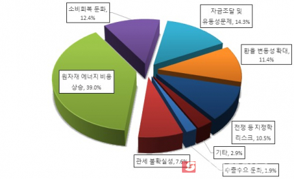 조사대상 업체의 올해 상반기 실적에 가장 영향을 미칠 것으로 예상되는 대내외 리스크 요인은 무엇인지의 물음에 ‘원자재·에너지비용상승’(39.0%), ‘자금조달 및 유동성문제’(14.3%), ‘소비회복 둔화’(12.4%), ‘환율 변동성 확대’(11.4%), ‘전쟁 등 지정학 리스크’(10.5%), ‘관세 불확실성’(7.6%), ‘수출수요 둔화’(1.9%), ‘기타’(2.9%)순으로 답했다.
