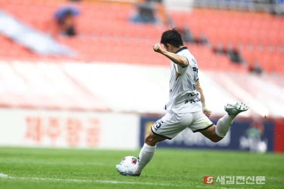 이제 시선은 K리그 100번째 홈경기로 향한다.김천상무프로축구단이 18일 오후 4시 30분, 제주월드컵경기장에서 열린 ‘하나은행 K리그1 2026’ 8R 원정경기에서 제주SK FC(이하 제주)와 1대 1로 무승부를 거뒀다. 어려운 원정길에서 승점 1점을 챙긴 김천상무는 이제 K리그 100번째 홈경기가 열리는 4월 21일 9R 강원전을 준비한다.김천상무는 4-4-2 포메이션을 가동했다. 백종범이 골키퍼 골문을 지켰다. 백포는 박철우, 이정택, 김현우, 김태환이 구축했다. 중원에는 박태준과 이수빈이 자리했고, 좌우 날개에 홍윤상과 고재현이 위치했다. 최전방은 이건희와 이상헌이 책임졌다.□ 백종범 슈퍼세이브 ▶ 박태준 선제골!김천상무는 지난 경기와 동일한 선발 라인업으로 경기에 임했지만, 교체명단에는 변준수, 노경호가 처음 이름을 올렸고, 부상에서 복귀한 김추잔을 포함하며 변화를 주었다.경기 초반 흐름은 김천상무가 주도했다. 전방에서부터 강력한 압박을 통해 제주를 거세게 몰아부쳤다. 제주도 이를 공략하기 위해 빠른 빌드업을 시도하며 대응했다. 전반 24분, 위기가 찾아왔다. 오른쪽에서 공격을 시도한 제주가 크로스를 올렸고, 골키퍼와 수비 사이로 크로스가 향했다. 상대 공격수가 이를 슈팅으로 연결했지만, 백종범이 끝까지 몸을 날려 팀을 위기에서 구해냈다.위기 뒤 곧바로 기회가 찾아왔다. 전반 27분, 제주 페널티박스 앞에서 박태준이 절묘한 드리블로 상대 파울을 유도했다. 이어진 프리킥을 직접 슈팅으로 처리했고, 수비벽에 굴절된 공이 그대로 골문으로 빨려들어가며 1대 0 리드를 잡고 전반을 마쳤다.